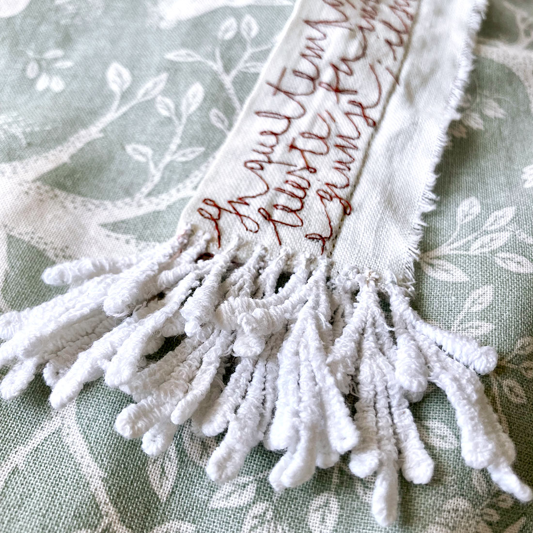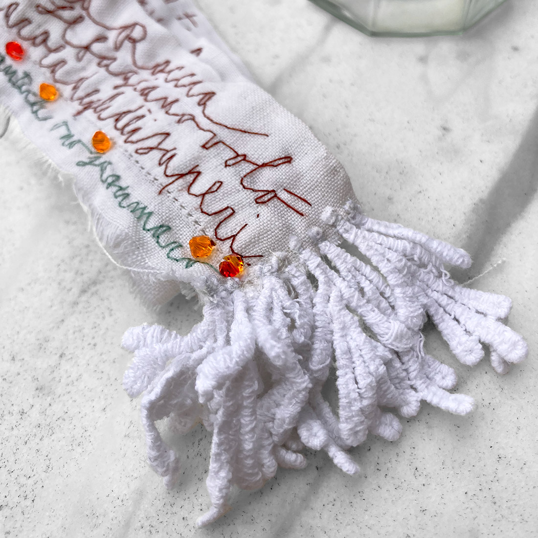 La striscia è rifinita ai bordi con ritagli di merletto di cotone cuciti a mano, che evocano le piume della coda e delle ali del fagiano, suggerendo visivamente l’idea del volo e del passaggio, ed è ricamata a mano con una frase tratta dal Kojiki, testo fondativo della mitologia giapponese (712 d.C.). Nel racconto un ambasciatore viene inviato dalla dea Amaterasu per informarsi sul suo ritiro nella Roccia Celeste. Questo messaggero è un fagiano, per la sua capacità di veicolare una risposta che si manifesta come presenza e risonanza.