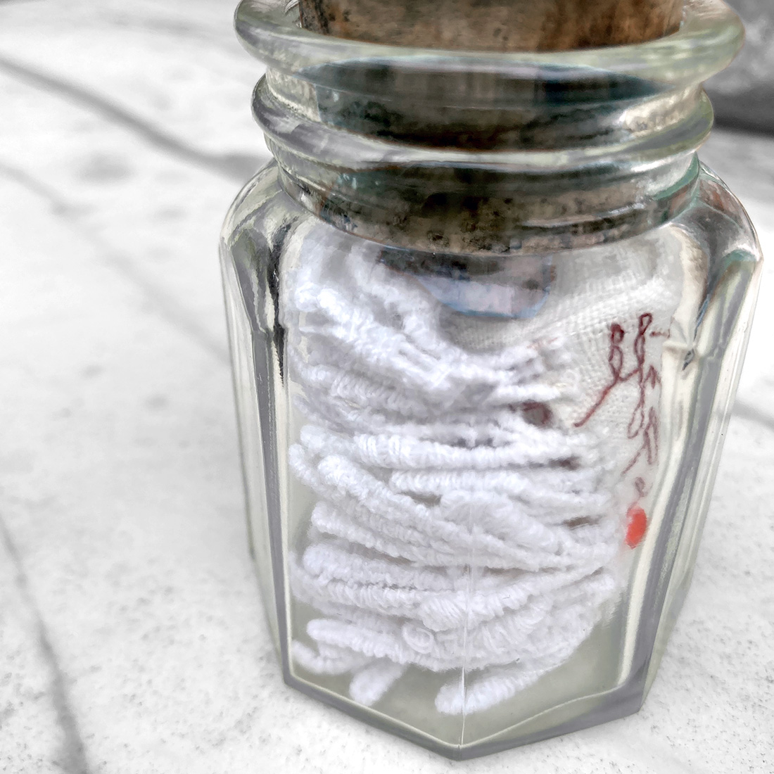 Talismano portatile in vetro con tappo in sughero, contenente una striscia di lino arrotolata e ricamata a mano con una frase tratta dal Kojiki, testo fondativo della mitologia giapponese.
