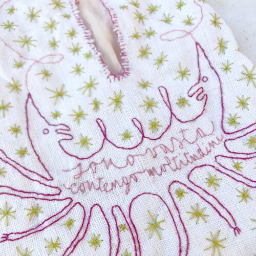 Composto nel 1875, Invictus è un inno alla resilienza e all’autodeterminazione. Il poema afferma l’esistenza di uno spazio inviolabile dentro l’individuo, una soglia che nessuna condizione esterna può conquistare. Le parole ricamate diventano una formula di autodeterminazione, ripetuta silenziosamente attraverso il gesto.