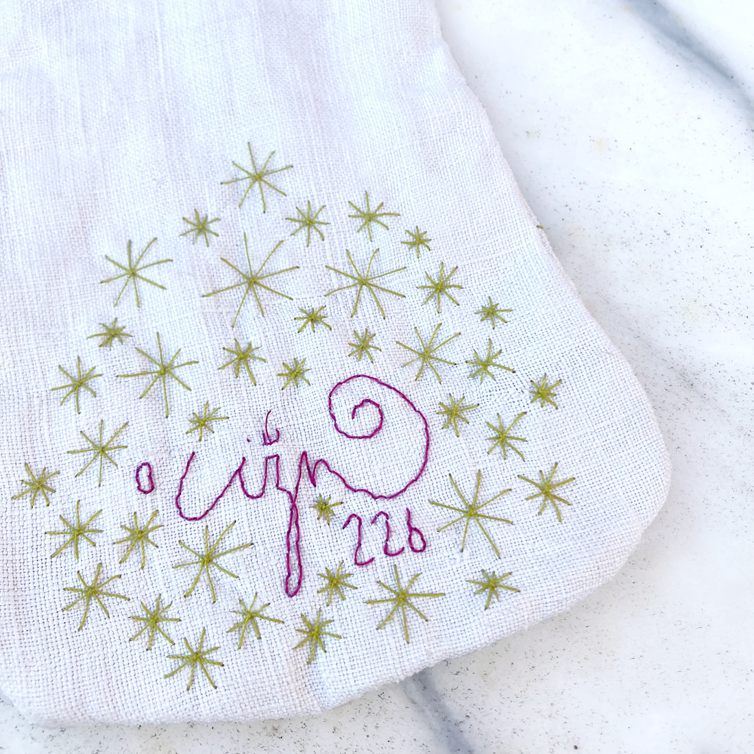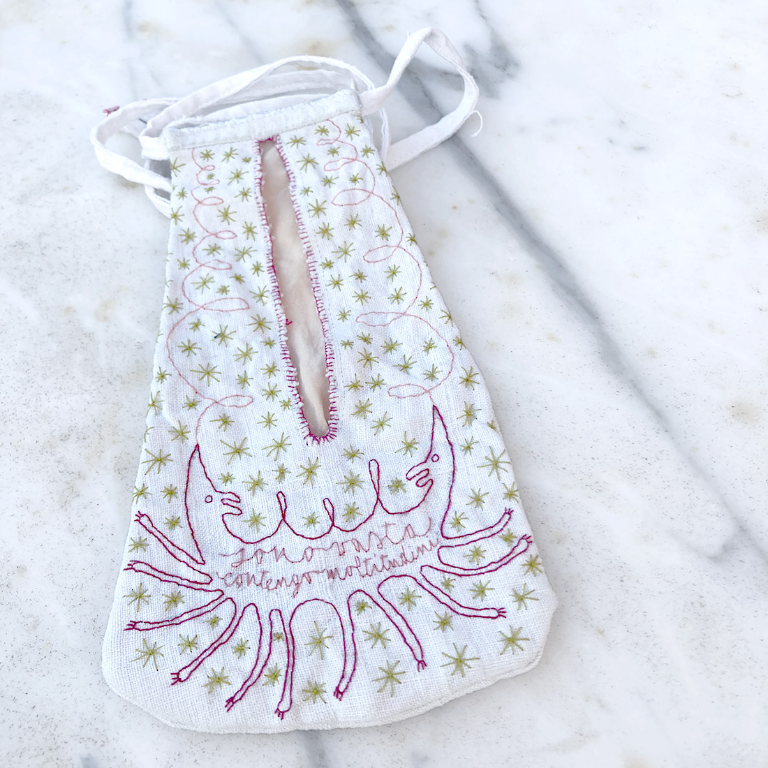 Tasca artigianale in lino, ispirata ai modelli storici da sottogonna in voga tra Seicento e Ottocento. Ricamata a mano con un lupo a due teste e la frase “sono vasta, contengo moltitudini” di Walt Whitman. Indossabile sopra o sotto gli abiti, è un oggetto simbolico dedicato alla molteplicità e alla dualità tra mente e intuizione.