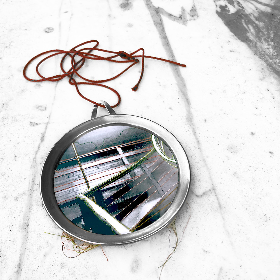 Medaglione circolare con un ricamo a mano di una fotografia in bianco e nero di un’antica scala altoatesina, cucita sul supporto di un colino in metallo. Sul retro un tessuto di lino vintage con ricamata la frase: “Non hai bisogno di vedere l’intera scalinata, inizia a salire il primo gradino”. Il talismano ha un cordoncino rosso per indossarlo.