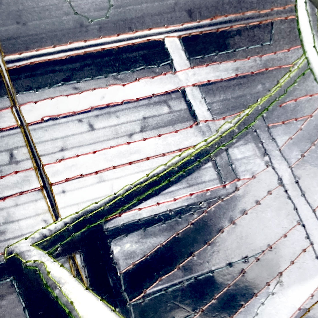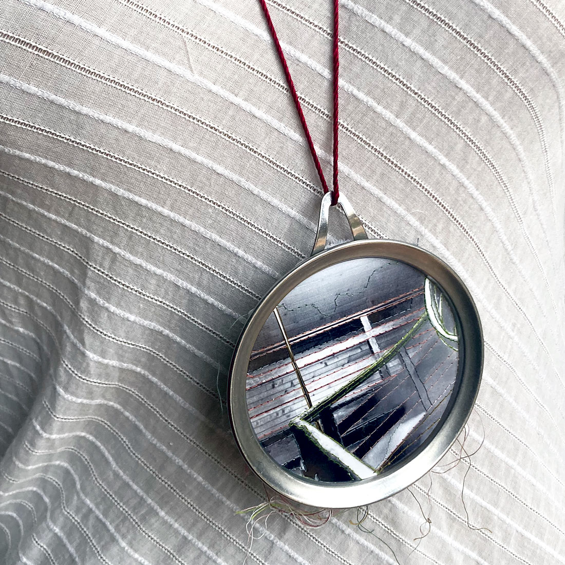 Medaglione indossabile con una fotografia analogica in bianco e nero della scala di un’antica residenza altoatesina, ricamata a mano. Sul retro la frase: “Non hai bisogno di vedere l’intera scalinata, inizia a salire il primo gradino” è ricamata su un ritaglio di lino. Appeso a un cordoncino rosso, invita a vivere nel presente e affrontare ogni passo con calma e coraggio.